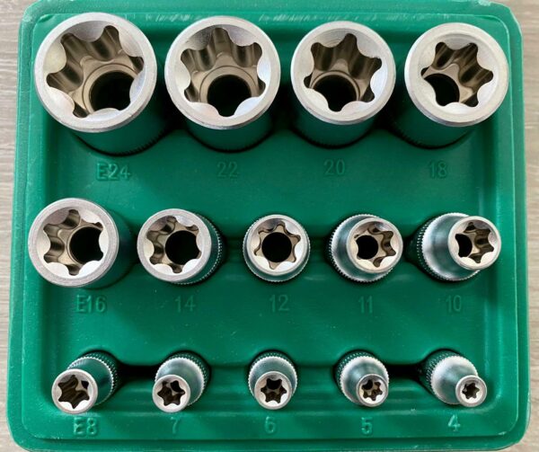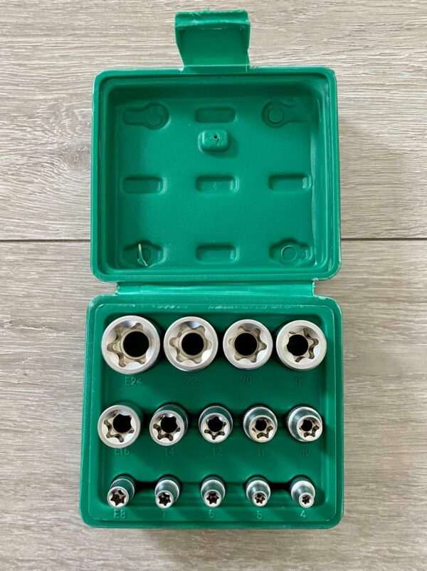 This is a brand-new Huaqi chrome 14pc 3/8 E Torx socket set . It comes in its own case for safekeeping. I will be despatching you a brand-new item, not the one from the photo.